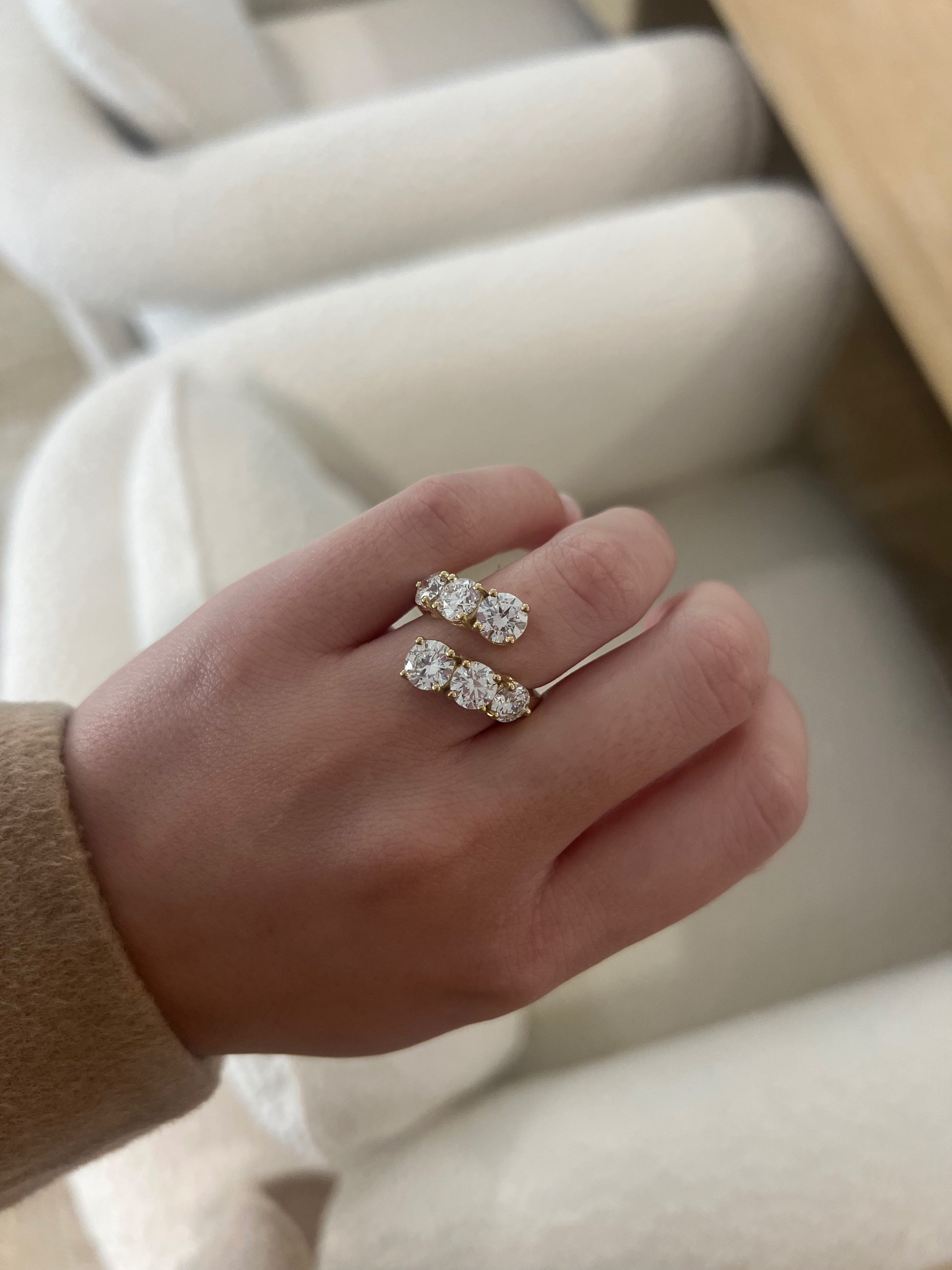 The Wrap Rock Ring features six round brilliant diamonds, artfully wrapped around the finger in a clean, sculptural silhouette. Whether chosen as a unique engagement ring or a contemporary dress piece, this design celebrates bold simplicity and enduring sparkle.